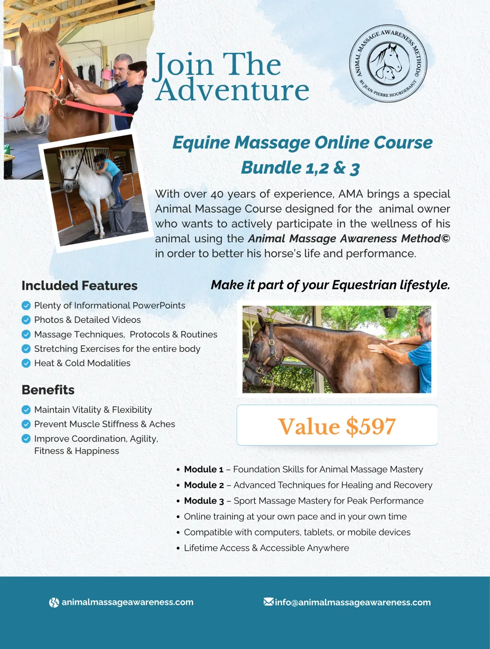 With over 40 years of experience, AMA brings a speciali Animal Massage Course designed for the animal owner who wants to actively participate in the wellness of his animal using the Animal Massage Awareness Method e in order to better his horse's life and performance