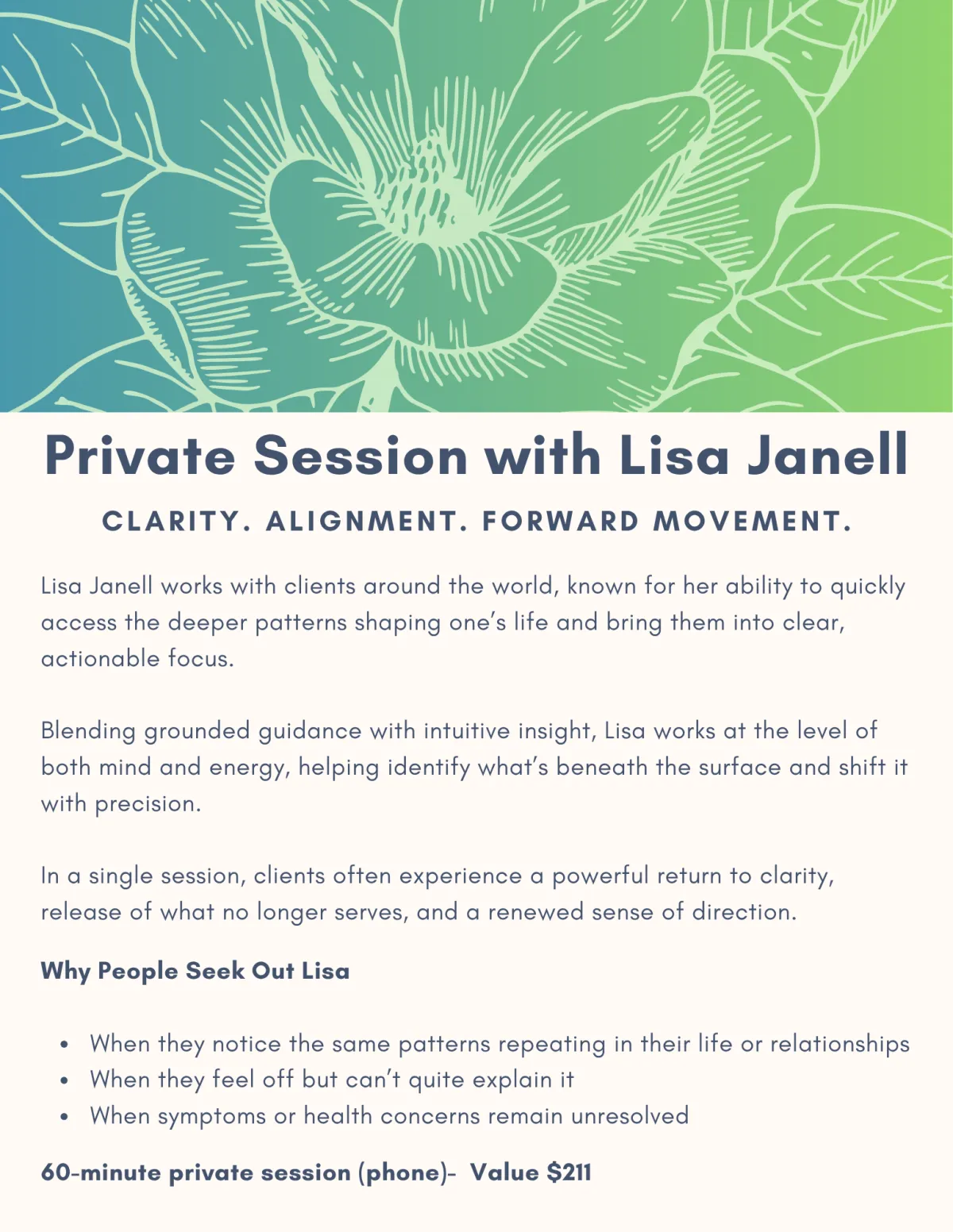 gain clarity, and move forward with focus. Blending practical guidance with intuitive insight, she helps individuals release what’s holding them back and