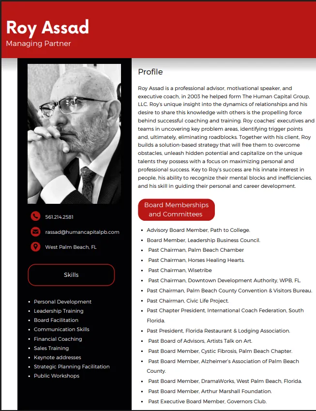 Roy Assad is a professional advisor, executive coach, and co-founder of The Human Capital Group, LLC. He specializes in helping executives and teams identify challenges, remove roadblocks, and unlock their full potential through practical, solution-focused strategies that drive personal and professional success.