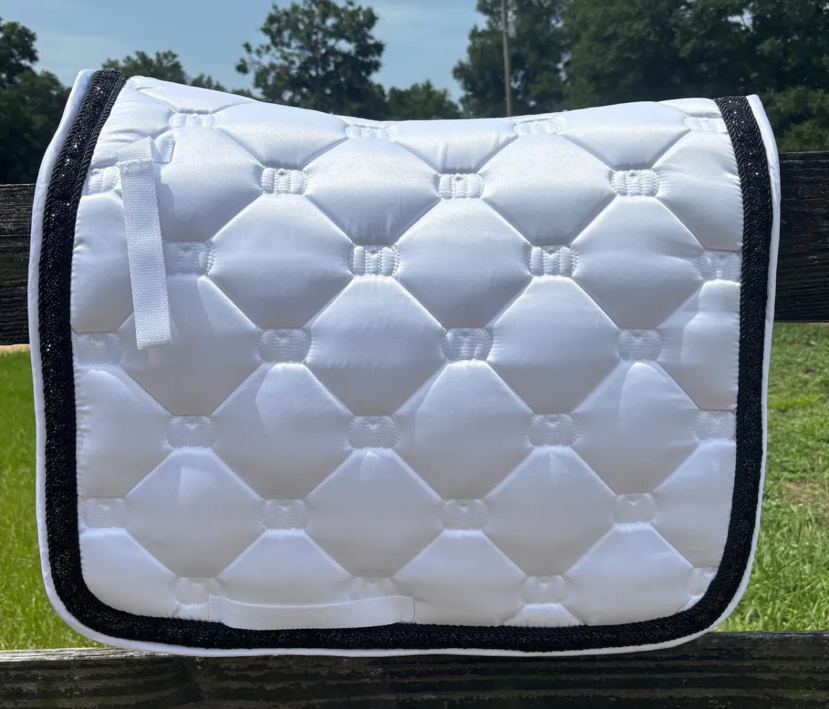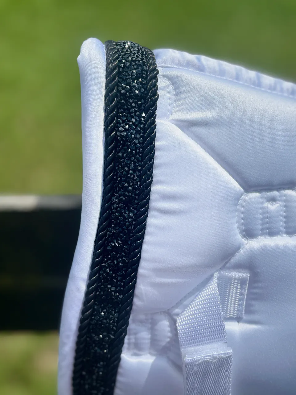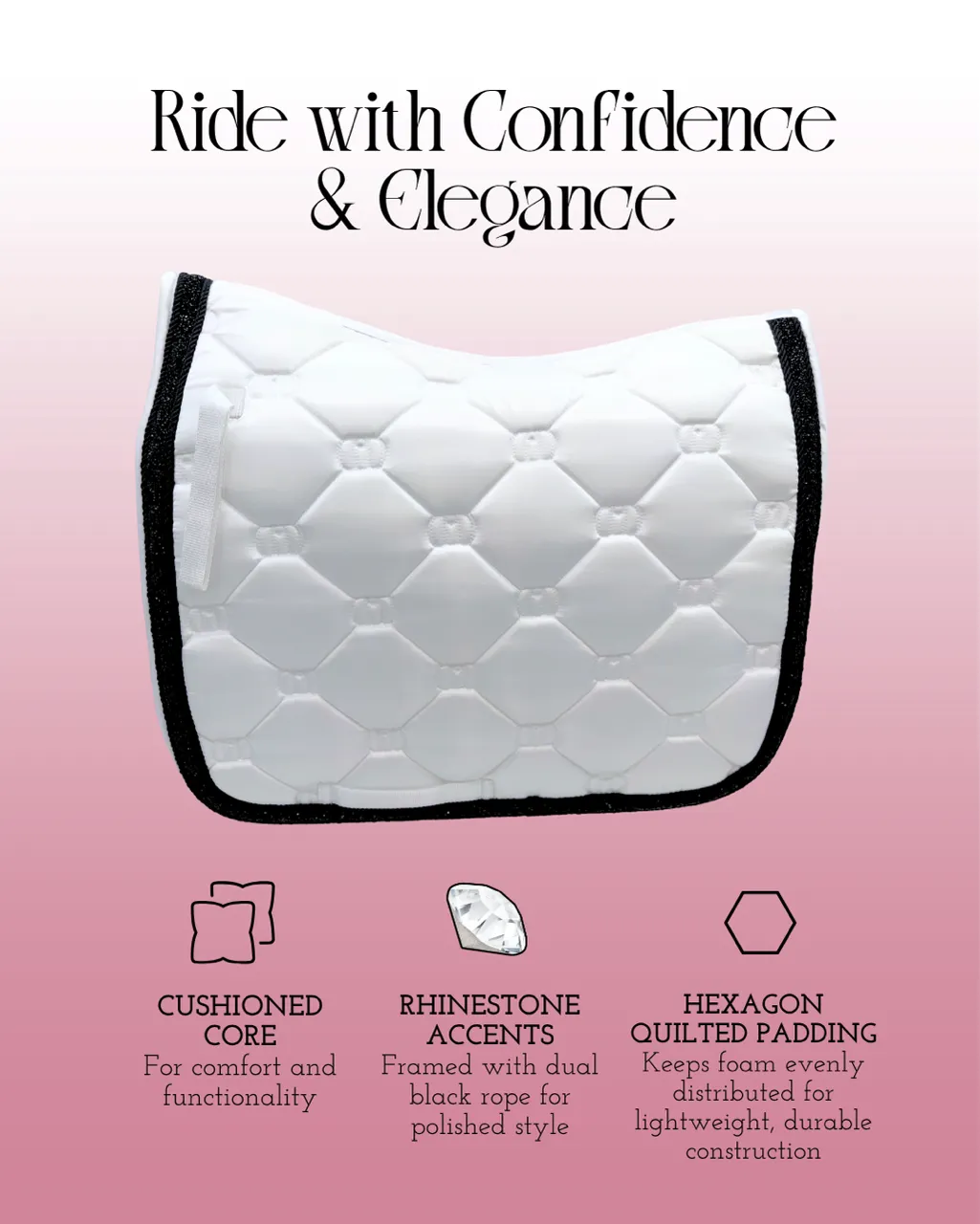 Ride with confidence and elegance with this luxury saddle pad & brow band set. Featuring rhinestone accents, dual black rope detailing, and hexagon quilted padding for comfort and durability. A perfect blend of performance and polished style.